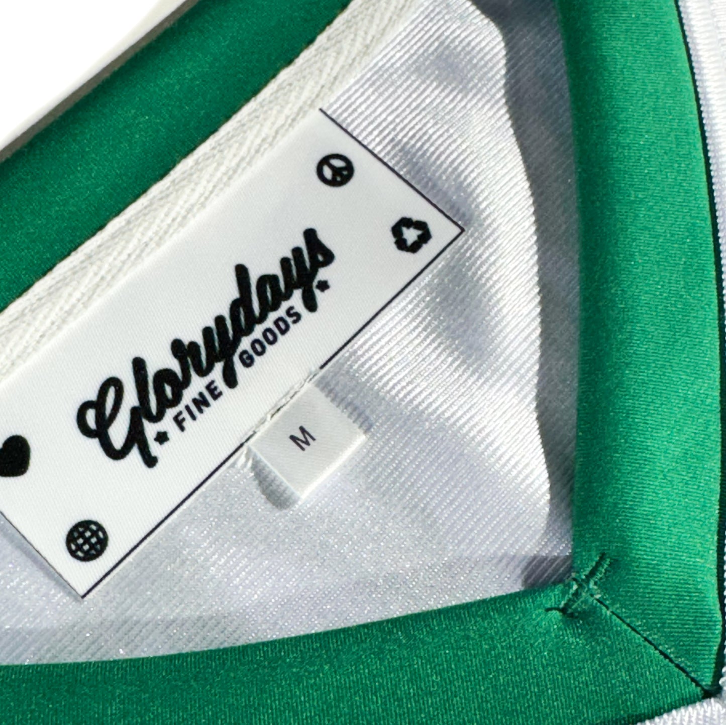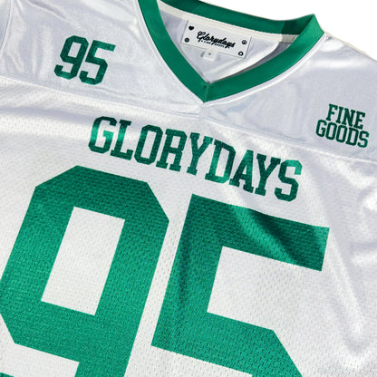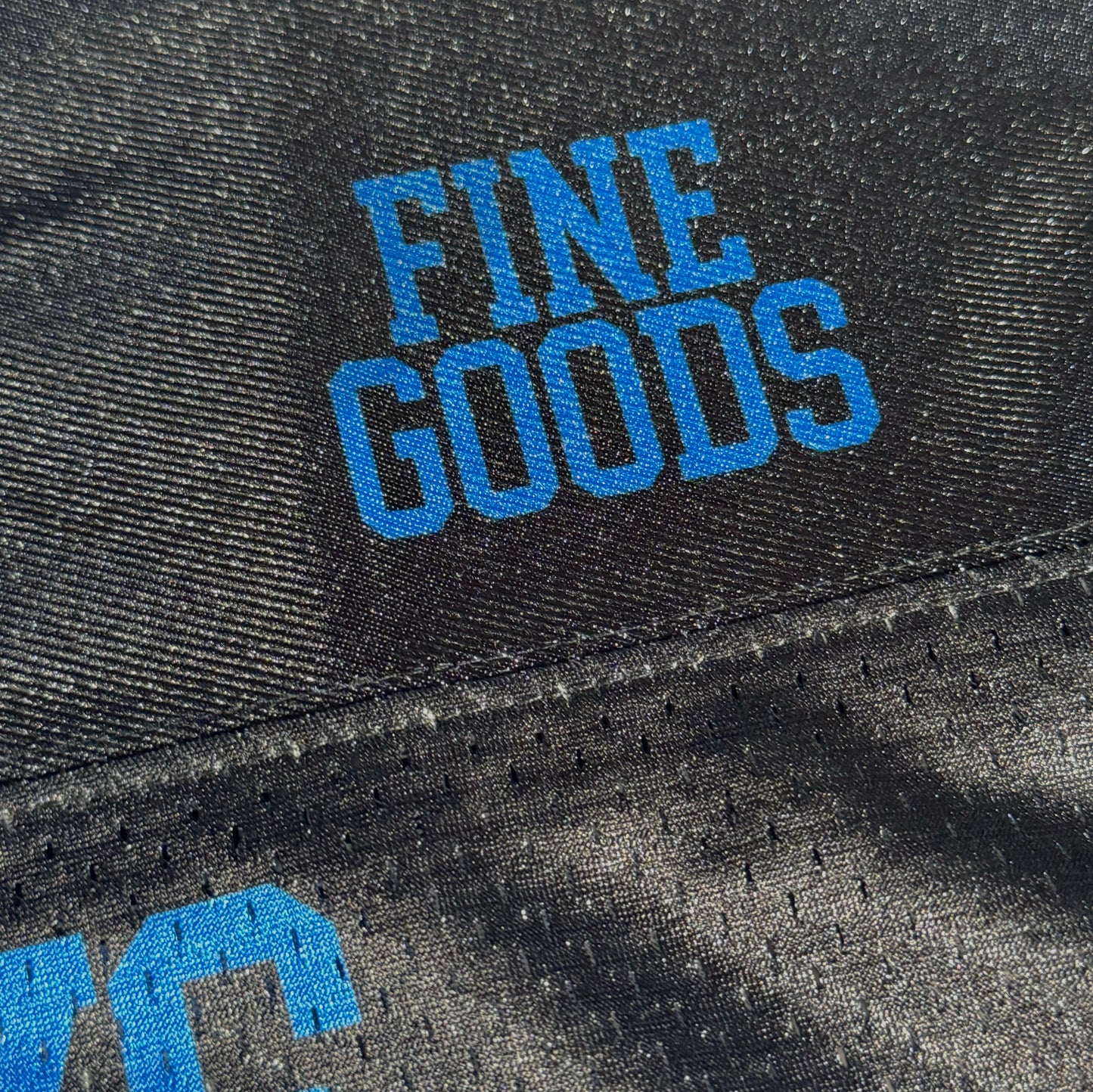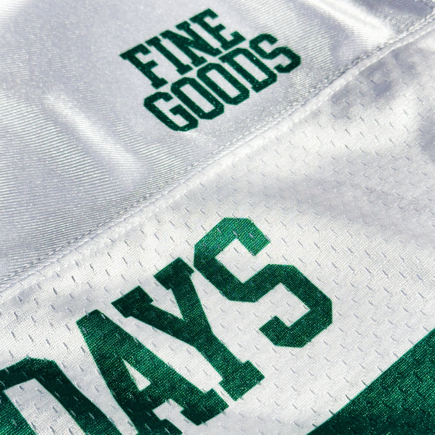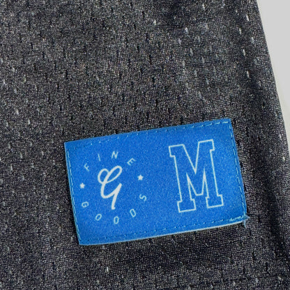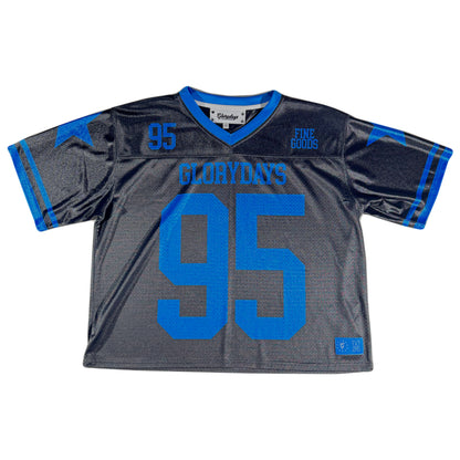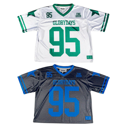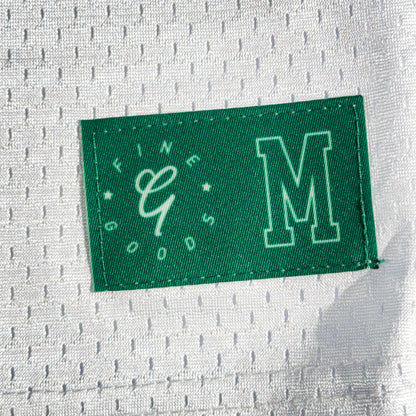 Boxy fit, slightly cropped mesh jersey with a ribbed v-neck and two-tone screenprint detailing.